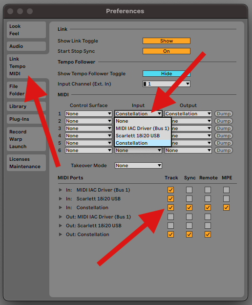 - In the MIDI Ports section, locate your Constellation external MIDI device.