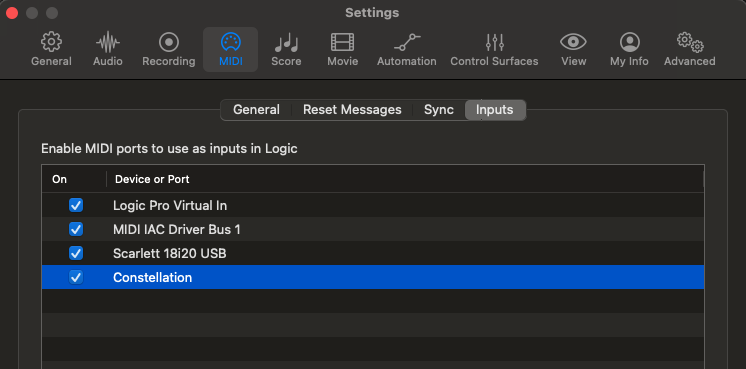 Let’s begin by verifying that Constellation is recognized as a MIDI device by Logic Pro. Go to Logic Pro → Settings → MIDI.