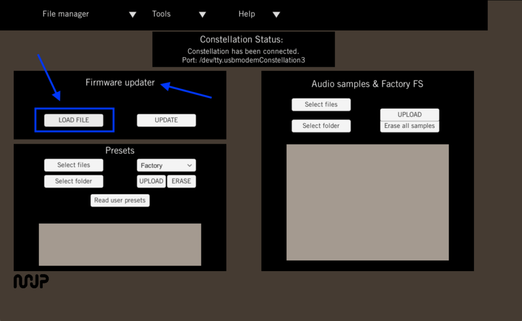 Same as Step 5, press LOAD FILE and select the binary file constellation_mcu_<xx>.bin.