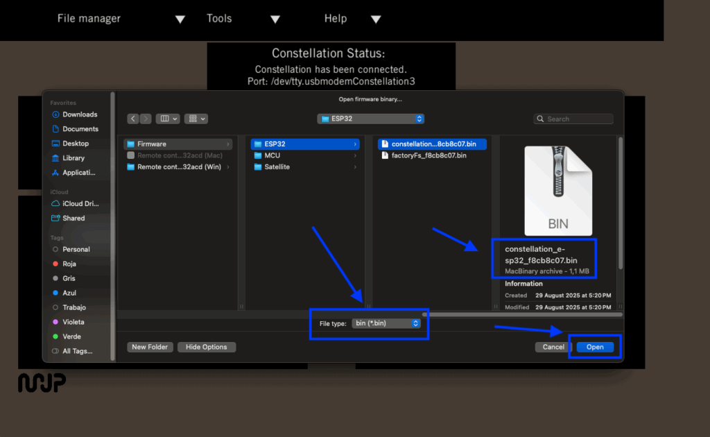 Select the binary file constellation_esp32_<xx>.bin.