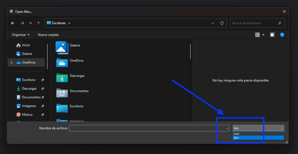 When browsing in the File Manager, the default filter may show only .wav files. To load the correct firmware, switch the filter to .bin files and select the appropriate binary file. See the image below.