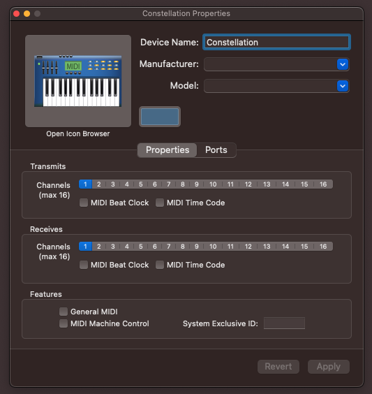Once your external MIDI device is created, you can configure its transmit and receive channels and assign it a custom name. This device will act as the communication bridge between Constellation and your virtual environment/MIDI instrument.