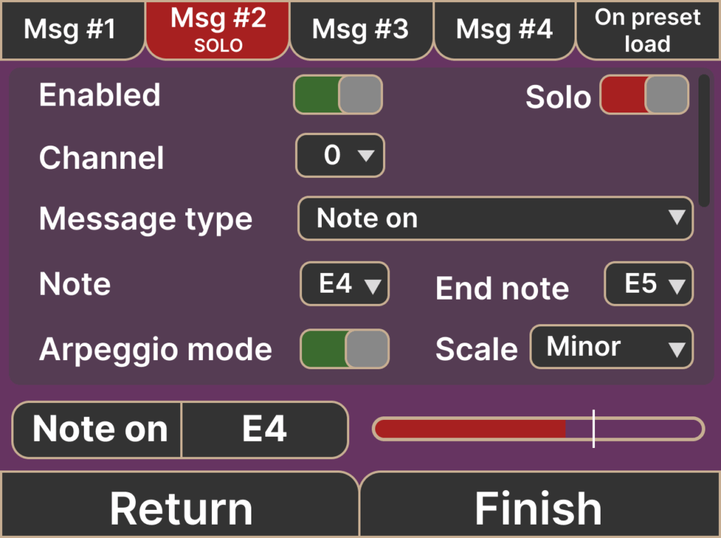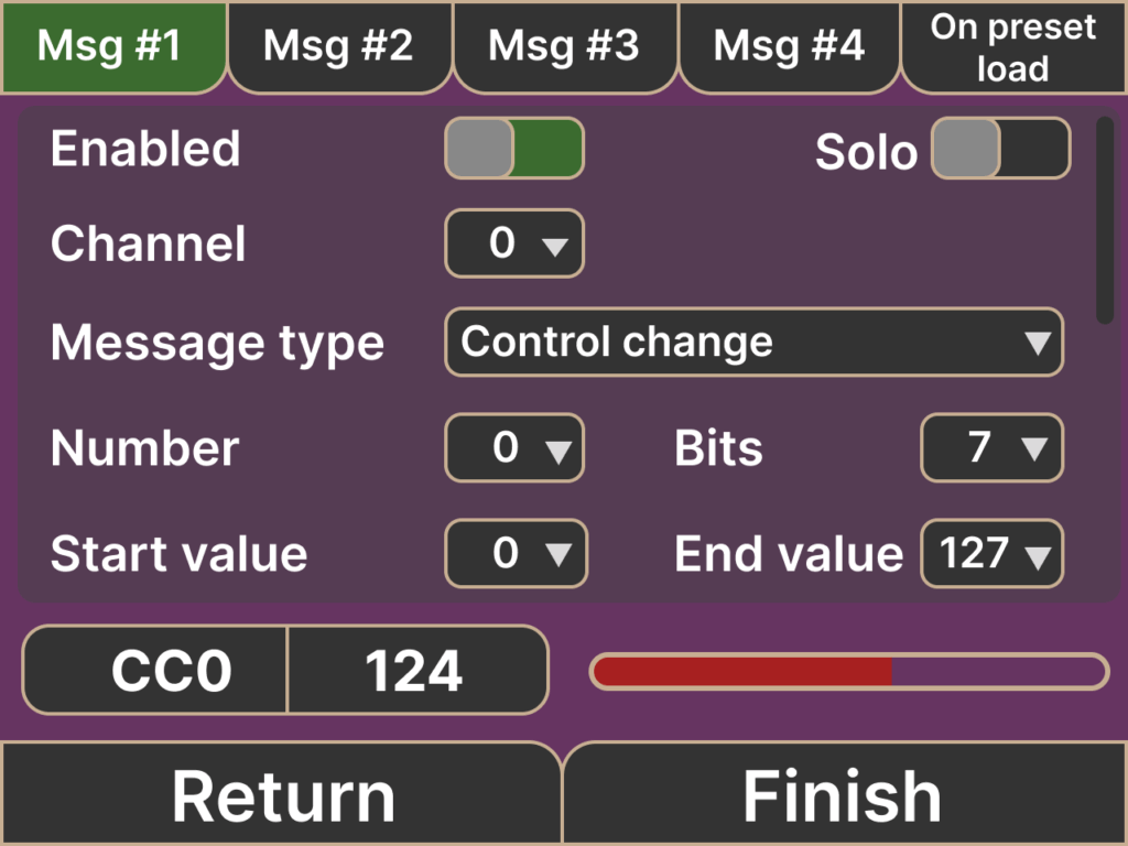At the top of this screen, you’ll see tabs for each MIDI message. Tap or swipe to access each message slot.